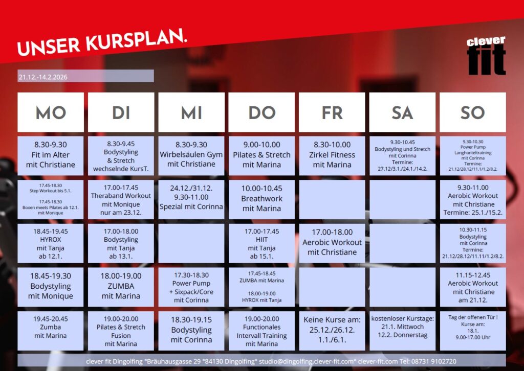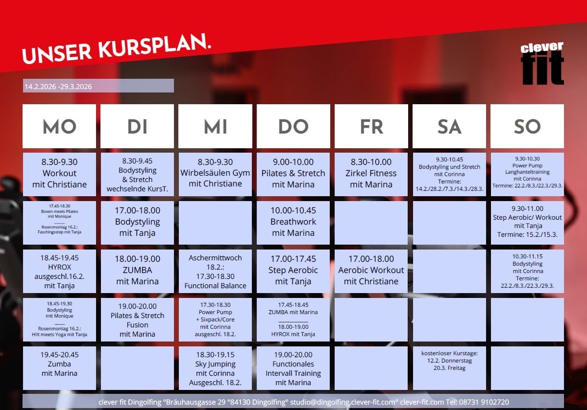 *Mindestvertragslaufzeit:1Monat I zzgl. einmalige Chipbandgebühr in Höhe von 19,90 EUR I zzgl. einer Servicegebühr in Höhe von halbjährlich 29,90 EURI Gesamtpreis für Mindestlaufzeit: 79,70 EUR I Preise inkl. USt. | Kündigung immer zum Ende des Folgemonats möglich. Ein Angebot der Monaco LA Fitness GbR, Bräuhausgasse 29, 84130 Dingolfing https://clever-fit.love-it.at/de/fitnessstudio/dingolfing/